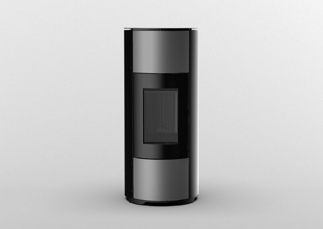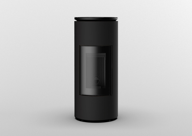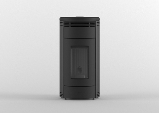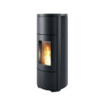 Poêle à pellets étanche en fonte et acier, forme ronde.